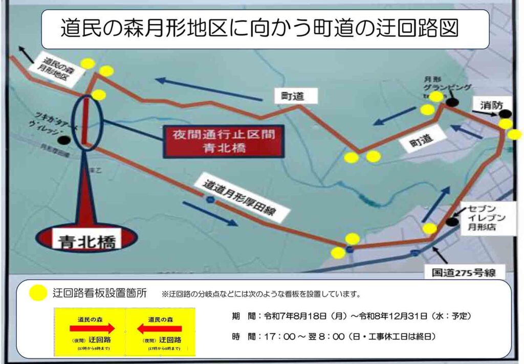 月形地区への進入路が夜間通行止めになります(迂回路図を変更しました)